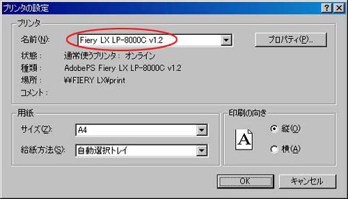 クリックすると下の「プリンタの設定」のダイアログが表示されます。プリンタの「名前(N)」がご自宅のプリンタになっているのを確認しましたら「OK」をクリックして下さい。